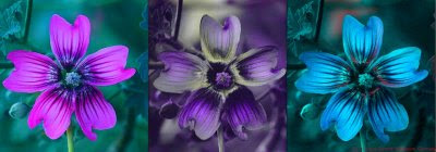 Triptych: Hibiscus sp in Human vision, reflected UV, simulated bee vision (left to right):